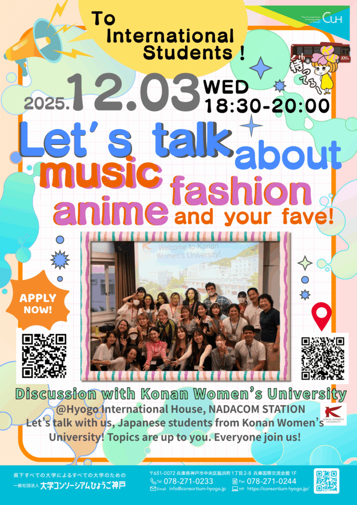 This event provides nice oppotunity to talk with Japanese students of university in frankly, cozy mood. The students who coming is learning in the class of “Global Citizenship Program” in Konan Women’s University. In this class, students create some program which can exchange international students and Japanese students. This time, the topics of the discussion will be about music, fashion, anime, comics, and about your country, cultural things, things about you learning in the university… it’s up to you!