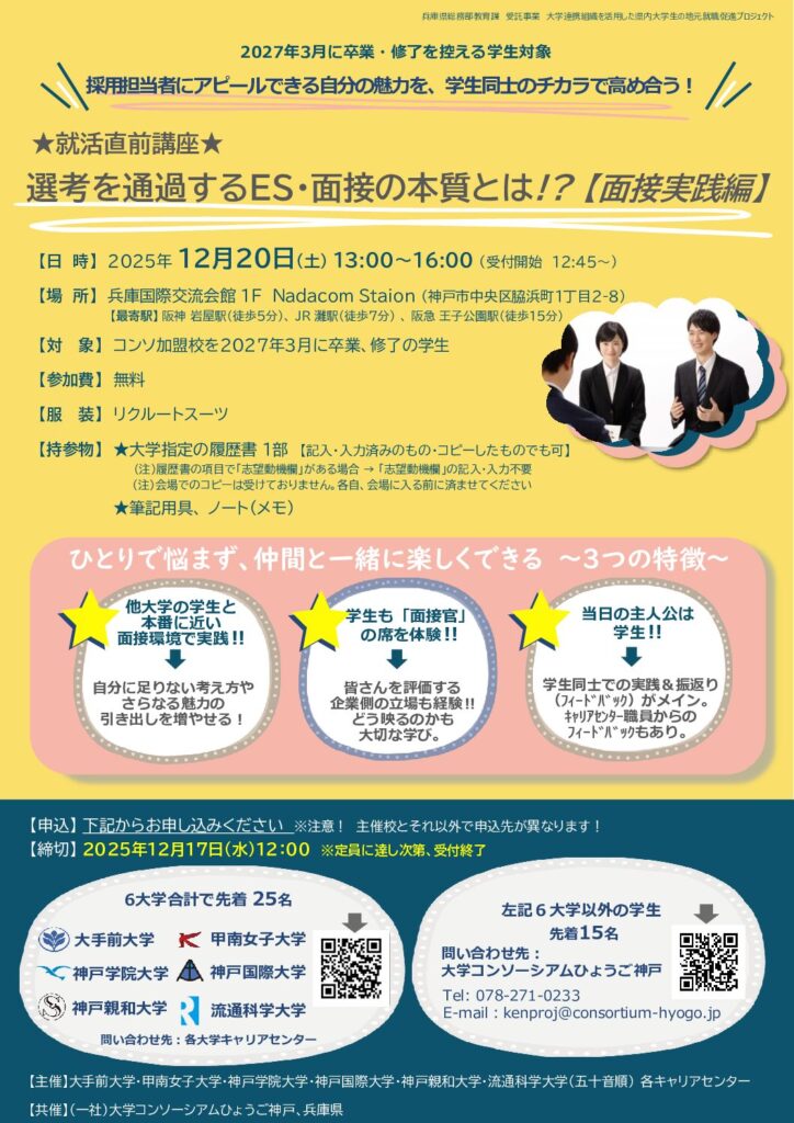 申し込み | 大手前大学・甲南女子大学・神戸学院大学・神戸国際大学・神戸親和大学・流通科学大学 の方(先着25名) https://ws.formzu.net/fgen/S883972015/ | |||