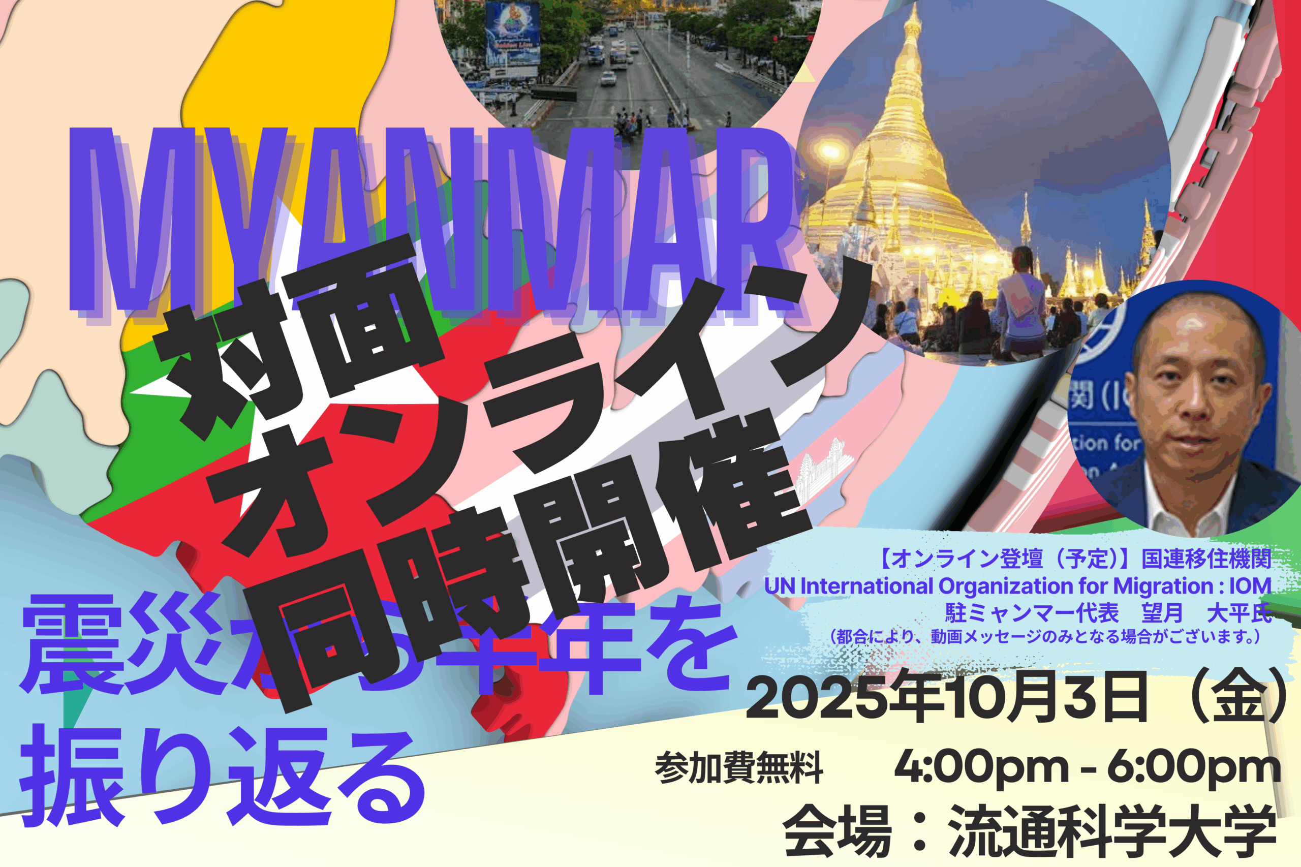 また、現在国連移住機関IOM(UN International Organization for Migration)駐ミャンマー代表を務める望月 太平氏とオンラインでつなぎ、現地の空気をそのまま伝えていただきます。ここでしか感じることのできない現地の生活の様子、そして世界からの支援活動の最前線を、日本の大学関係者、学生の皆さんとシェアしたいと思います。