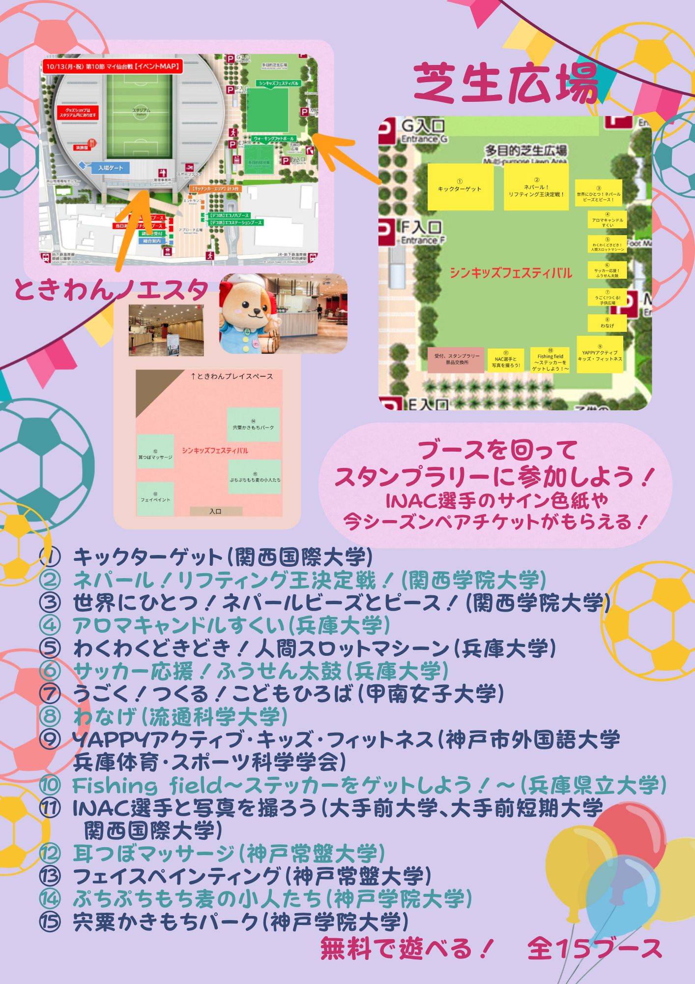 各ブースでINAC神戸vsマイ仙台戦(10/13, 15時キックオフ)の無料観戦チケットがもらえる!シンキッズフェスティバルの後には、15:00キックオフのINAC神戸レオネッサの試合観戦もぜひお楽しみください!