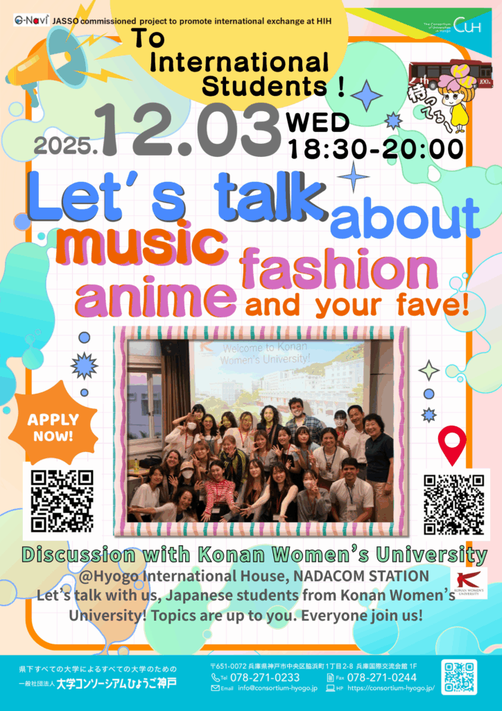 This event provides nice oppotunity to talk with Japanese students of university in frankly, cozy mood. The students who coming is learning in the class of “Global Citizenship Program” in Konan Women’s University. In this class, students create some program which can exchange international students and Japanese students. This time, the topics of the discussion will be about music, fashion, anime, comics, and about your country, cultural things, things about you learning in the university… it’s up to you!