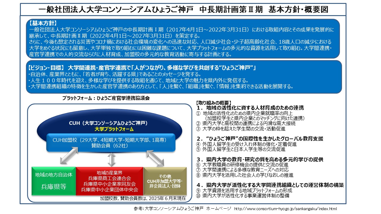 「平成29年度 私立大学等改革総合支援事業(タイプ5 プラットフォーム型)」に「ひょうご産官学連携協議会」として採択以来、「ひょうご産官学連携協議会 中長期計画」「ひょうご産官学連携協議会 中長期計画Ⅱ期」に沿って着実に取組みを進めてまいりました。